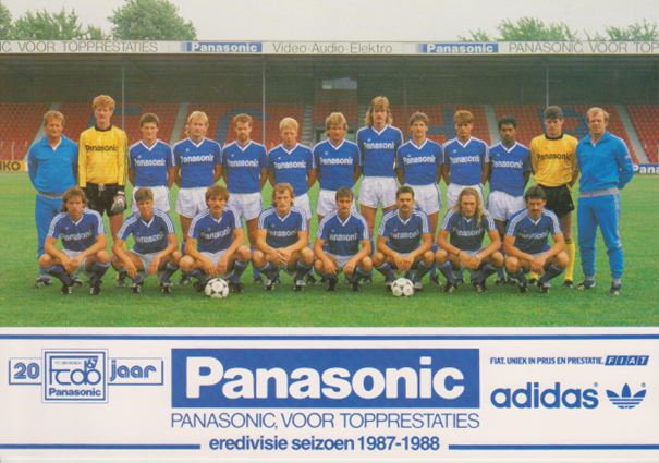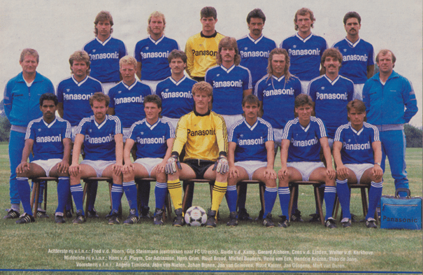 Bovenste rij van links naar rechts: Hans van der Pluijm, Jan van Grinsven, Johan Bijnen, Gijs Steinmann, John van Nielen, Henk Grim, Cor Adriaanse, Michel Beukers, Ruud Brood, Mart van Duren, Angelo Timisela, Guido van de Kamp, Theo de Jong.