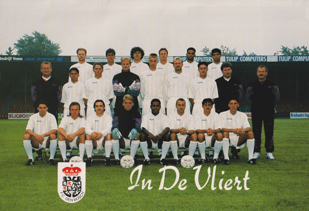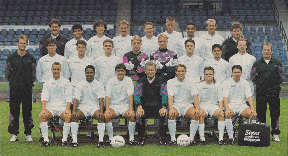 Middelste rij van links naar rechts: Hans van der Pluijm, René Nijhuis, Carel van de Velden, Dennis van de Poll, Jago Laros, Charly van de Stock, Wim Volkerink, Peter Flint, Cor Adriaanse, Jos van de Berg.